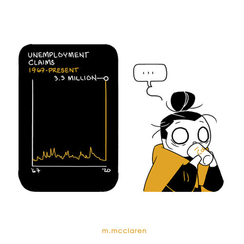 [Description: A two panel comic showing first the graph depicting unemployment claims from 1967 to now. There is a STEEP upward tick in the last week. And then me, reacting to the news as calmly as I can.]