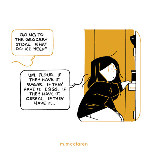 [Description: A one panel comic that shows me kneeling in front of the pantry, taking stock of things we need, but due to the current atmosphere of pandemic buying might not be available.]