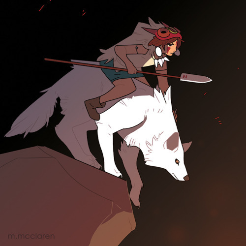 [Description: An illustration of Princess Mononoke from Studio Ghibli. She is riding a wolf, looking down at glowing light.]