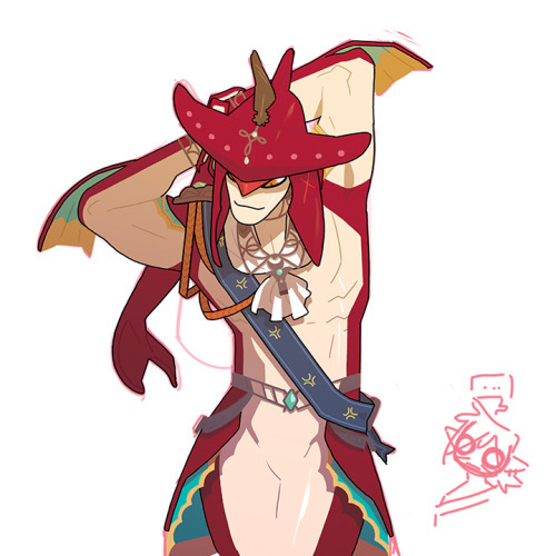[Description: An illustration of Prince Sidon from Zelda: Breath of the Wild. He is stretching. It’s nice to look at. In the background is a sketch of Link, who doesn’t know what to do with himself in the face of so much handsome.]