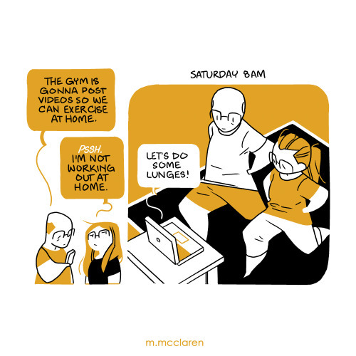 [Description: A two panel comic where my Dad informs me that our gym will be posting work out videos online to help during the pandemic. I relate that I am definitely NOT going to be working out at home. But by the second panel, I am awake at 8 am on a Saturday, doing lunges with my father.]