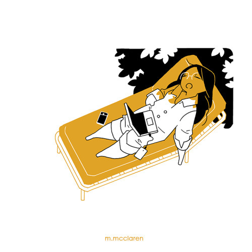 [Description: A cartoon of myself asleep on a lounge chair underneath a tree. Around me are the various tools I use to work from home. They are all forgotten in the pursuit of naps.]