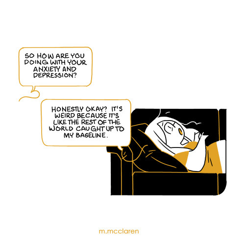 [Description: A one panel comic wherein I am explaining to my nurse that I’m handling things well, despite everything, because I am already used to this level of anxiety.]