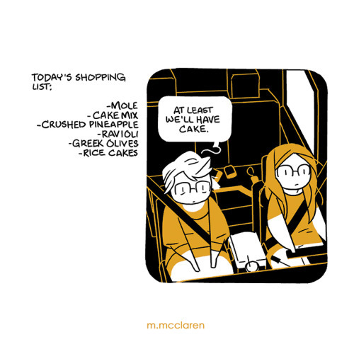 [Description: A two panel comic, the first panel showing a grocery list, the second me and my mom driving as my mom reflects that ‘at least we’ll have cake.’]