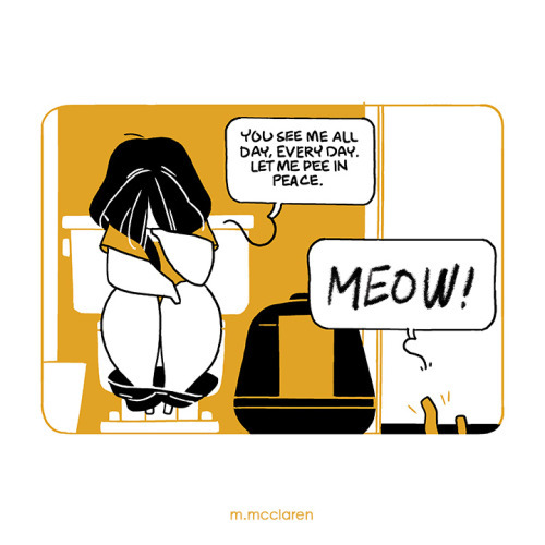 [Description: A cartoon of myself, sitting on the toilet with my head in my hands. I am asking my cat to give me a moment’s peace. She is not having it and is trying to squeeze underneath the door to get to me.]