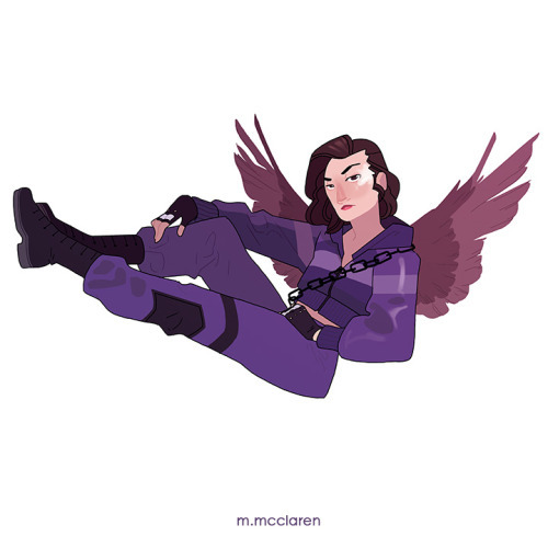 [Description: An illustration of Huntress as she appeared in BIRDS OF PREY. She is reclined, with two small wings on her back.]