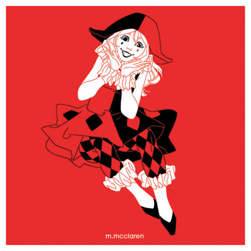 [Description: A red, white, and black illustration of Harley Quinn in a more traditionally inspired harlequin outfit.]
