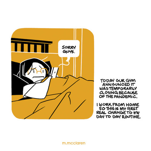 [Description: A one panel comic explaining that my gym is closing due to the pandemic. As I work from home, this is the first real big change to my day to day routine.]