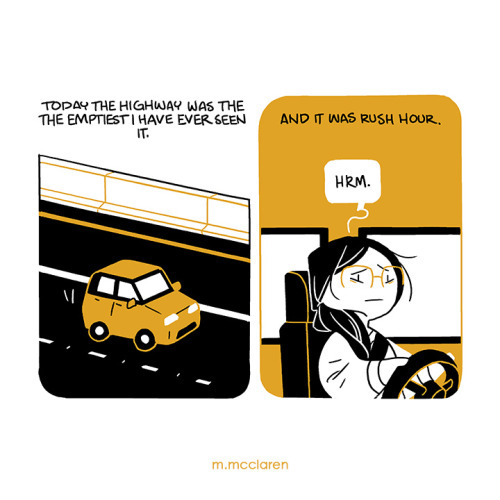 [Description: A two panel comic showing me driving down a deserted highway during rush hour. Because of the pandemic it is jarringly empty.]