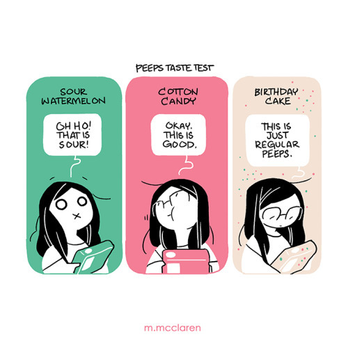 [Description: A three panel comic wherein I try the Sour Watermelon, Cotton Candy, and Birthday Cake. The sours were very sour. The cotton candy was good. Birthday cake just tasted like regular Peeps. Which is still good. But not quite what I wanted.]