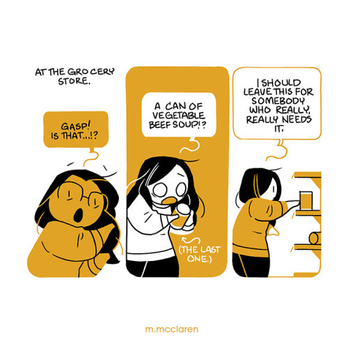 [Description: A three panel comic wherein I find THE LAST CAN of Vegetable Beef soup, which thrills me. I put it back for whomever might really, really need it though.]