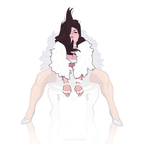 [Description: An illustration of Halsey as she appeared in the music video ‘Nightmare.’  She is wearing white stockings, lingerie, and a fur coat, sitting on an antique chair on top of a white reflective floor.]