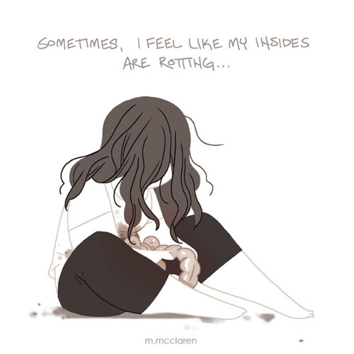 [Description: A cartoon of myself, sitting on the floor laughing, beside a pug that is upside down and balanced on her surgical cone.]