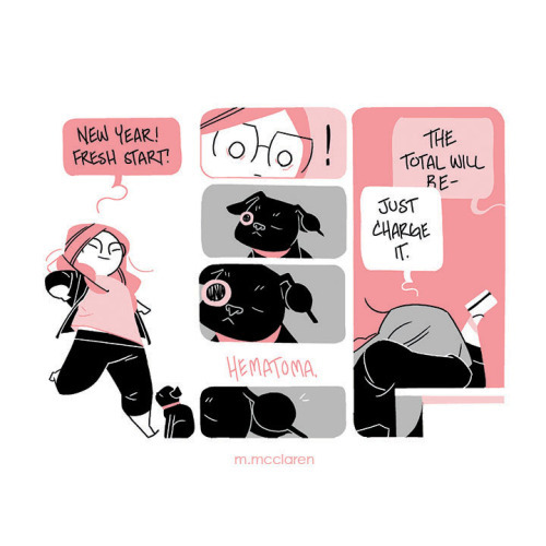 [Description: A short comic depicting me, happy that I get a fresh start with the new year. Then I discover my pug has a hematoma on her ear. Which results in a vet visit and a hefty bill.]