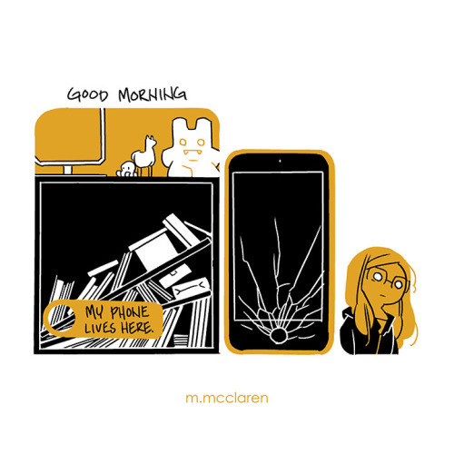 (Description: A three panel comic, showing my collapsed bookcase, where my phone lives, followed by my heavily cracked phone, and a shell shocked me.)
