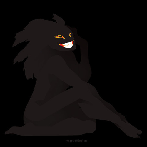 [Description: A dark figure sitting on the ground. The entire composition is mostly black with the exception of bright gold, white, and red teeth and eyes.]