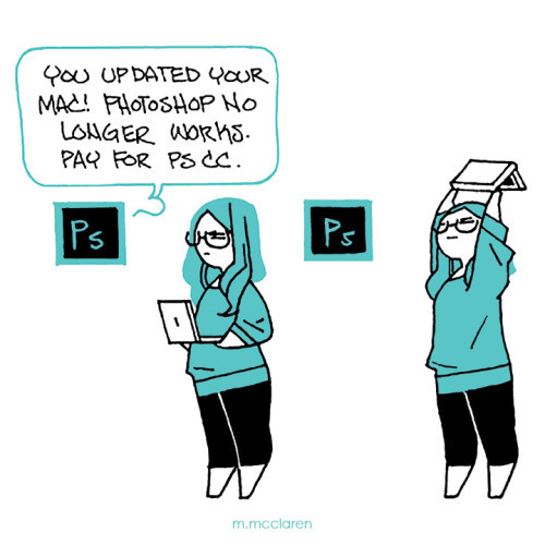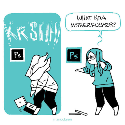 [Description: A comic depicting my conversation Photoshop. I updated my OS and it killed my Photoshop CS6, leaving me no choice but to buy PS CC. In response, I smash my computer and ask ‘What now, motherfucker?’.]