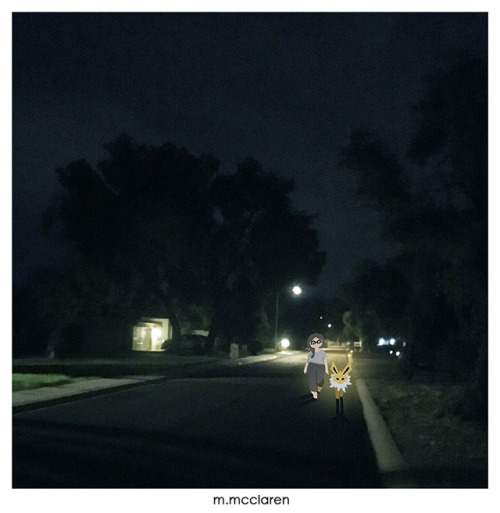 [Description: A neighborhood street at night. A cartoon of myself walks down the street alongside a Jolteon from Pokemon.]