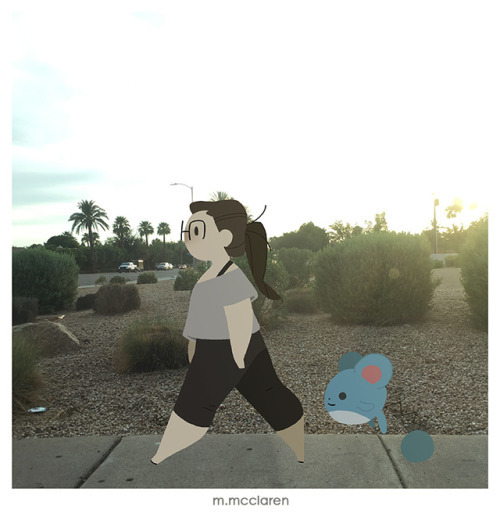 [Description: A photo of a street sidewalk at sunset. A cartoon of myself walks with a Marill from Pokemon behind me.]