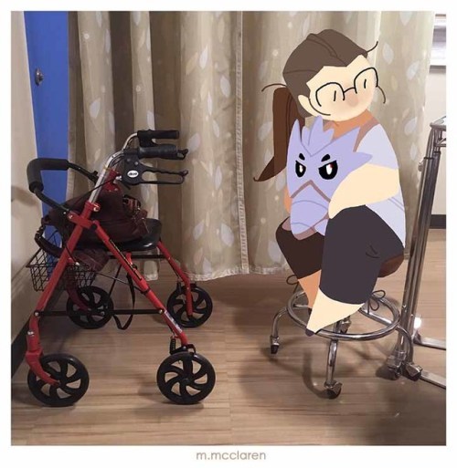 [Description: A photo of a hospital room. A cartoon of myself sits on a stool beside a walker. I am holding a Pupitar from Pokemon.]