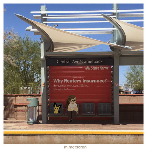 [Description: A photo of a light rail stop. A cartoon of myself and a Pichu from Pokemon are seated in the shade.]