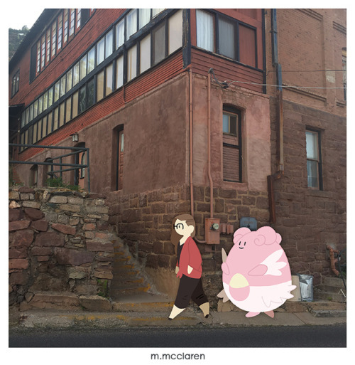 [Description: A photo of a small town street. A cartoon of myself walks along the sidewalk followed by a Blissey from Pokemon.]