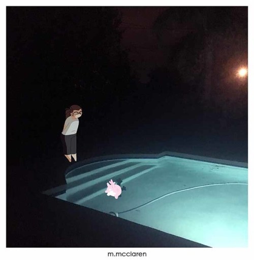 [Description: A photo of a pool at night. A cartoon of myself stands at the end of the pool, looking down at a Corsola from Pokemon.]