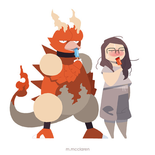 [Description: An illustration of myself standing beside a Magmar from Pokemon. We are both enjoying a popsicle. I am sweating.]