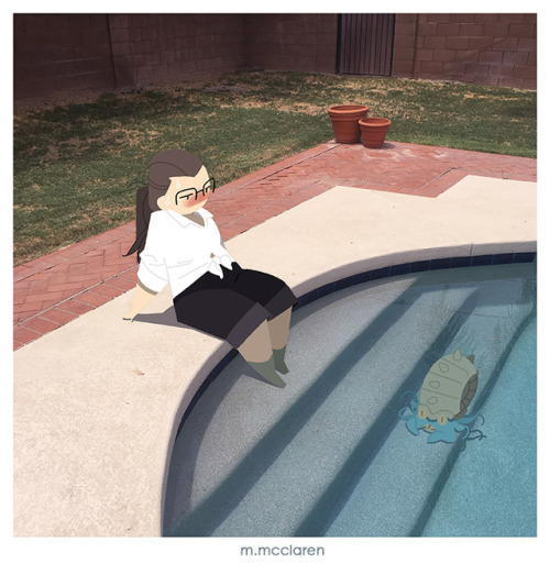 [Description: A photo of a backyard pool. A cartoon of myself has my feet soaking on the steps, while lower down in the water a Omastar from Pokemon hangs out.]