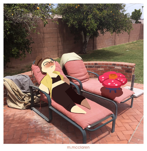 [Description: A photo of two backyard pool lounge chairs. In one chair is me, soaking in the sun. In the other chair stands a Vileplume from Pokemon. Also sunning.]