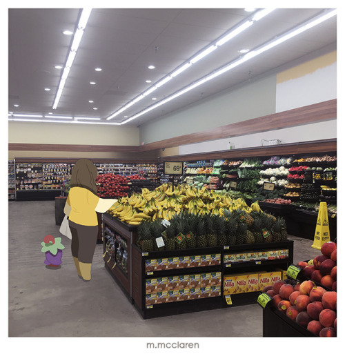 [Description: A photo of the produce section of the grocery store. A cartoon of myself peruses the fruit next to a Cherrim from Pokemon.]