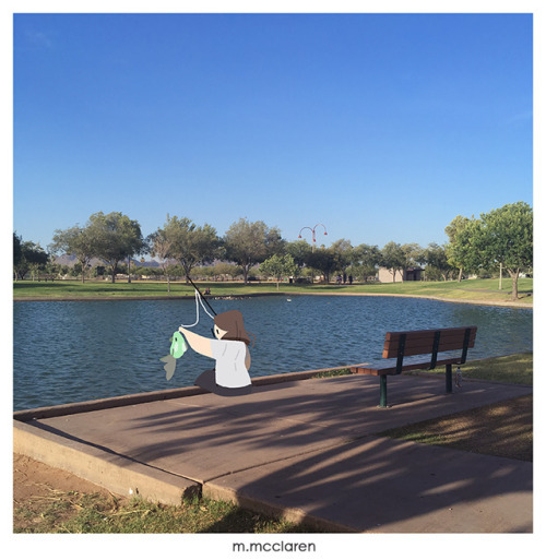 [Description: A photo by a park lake. Sitting at the edge is a cartoon of myself. I am holding a fishing pole and have caught a Remoraid from Pokemon.]