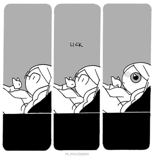 [Description: A three panel comic that depicts me and my foster kitten lying on the bed. In the second panel the kitten licks my chin. In the third panel, I am clearly overwhelmed with emotion.]