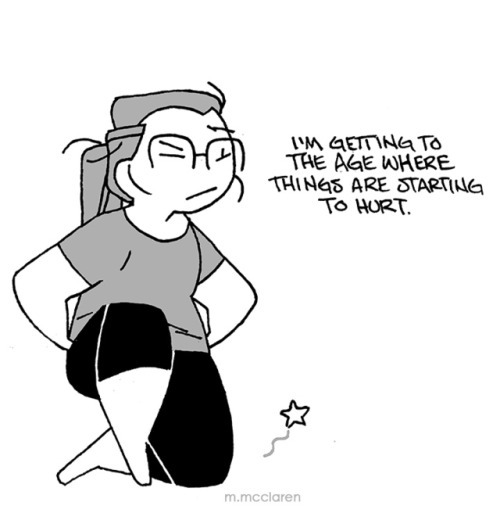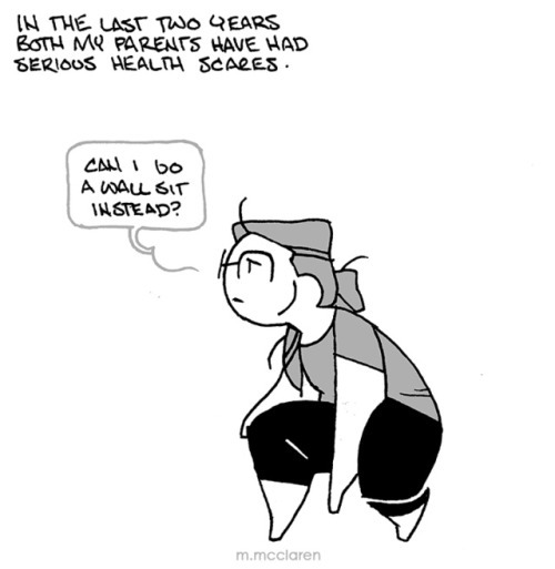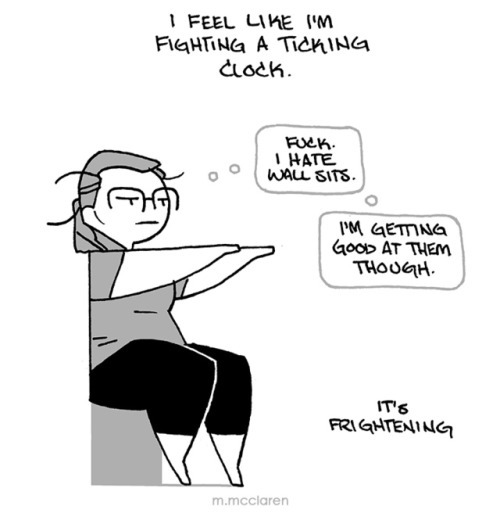 [Description: A three panel comic depicting me trying and failing to do lunges, as they hurt my knees. I explain that I’m getting to an age where things are starting to hurt. To compensate for the lunges, I do a wall sit instead, which I hate, but am ultimately getting good at because I have to do them so often. I further explain that I feel like I’m fighting a ticking clock. And it’s frightening.]