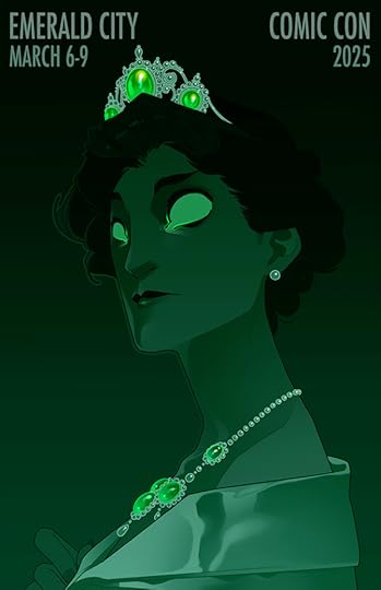 Description: An illustration in all green of a high class woman from around the 1940s. It’s a close up portrait with her in ¾ view facing the left side with her eyes blankly turned towards the camera. Her jewelry stands out, shining with bright green emeralds. Especially towards the top where the rest of the illustration becomes darker. Text reads: ‘Emerald City Comic Con, March 6-9 20025