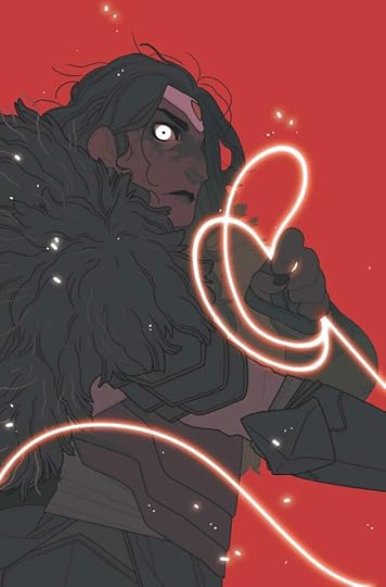 Description: A bust illustration in profile of the Absolute Wonder Woman rendition of Diana. Darkly colored in grey tones, she stands out against a red background, with the focus point being one starkly white eye turned to the audience. She is wrangling her lasso as it glows against the piece.