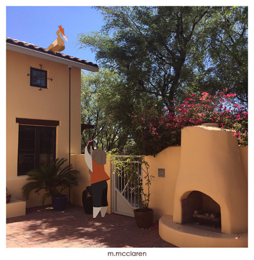 [Description: A photo of an outside patio. A cartoon of myself holds my phone up to get a picture of a Fearow from Pokemon as it sits on the nearby roof.]