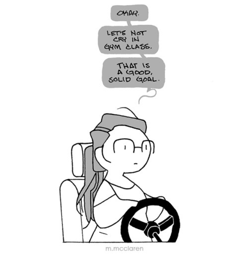 [Description: An illustration of myself sitting at the driver’s wheel of a car. I stare blankly ahead as I say ‘Okay. Let’s not cry in gym class. That is a good, solid goal.’]