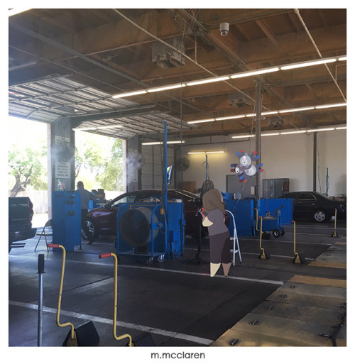 [Description: Photo of a car garage. A cartoon of myself meanders through the machinery beside a Magneton from Pokemon.]