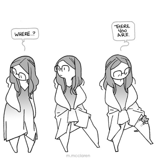 [Description: A three image comic. It depicts me first looking around and asking ‘Where?’ I lift up the hem of my dress and stick out a leg. Immediately, a kitten attacks my leg. To which I respond ‘There you are.’]