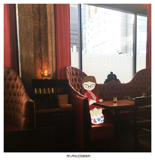 [Description: A photo inside a cocktail bar. A cartoon of myself sits at a table beside a Togepi from Pokemon.]