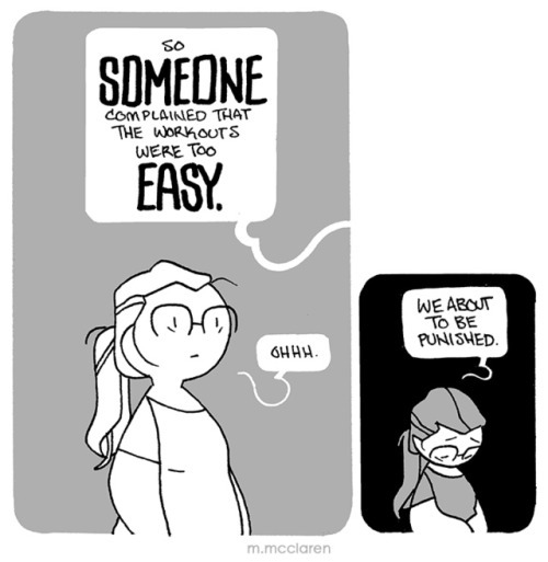 [Description: A two panel comic. The first panel shows a worried me as our trainer says ‘So SOMEONE complained that the workouts were too EASY.’ To which I respond ‘Ohhh.’ In the second panel, I look down wary and respond ‘We about to be punished.’]