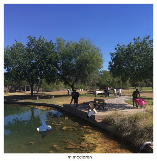 [Description: A photo of a park lake. A cartoon of myself sits at the ledge. In the water is a Sharpedo from Pokemon.]