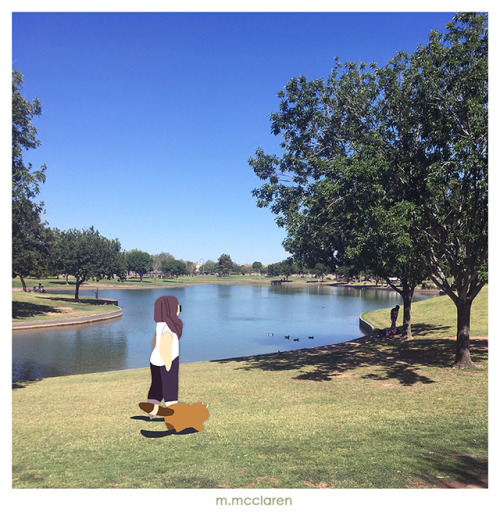 [Description: A photo of a park lake. A cartoon of myself walks alongside a Bibarel from Pokemon.]