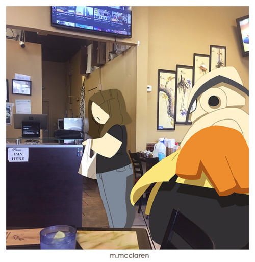 [Description: A photo inside a Vietnamese restaurant. A cartoon of myself stands by the cash register, collecting my order. Behind me is a Hariyama from Pokemon.]
