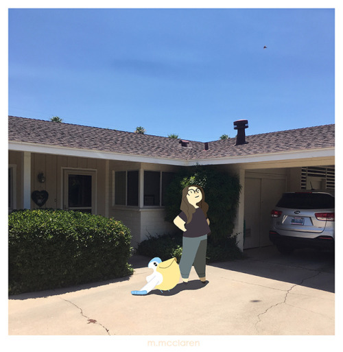 [Description: A photo of a sunny driveway. A cartoon of myself stands beside a Pelipper from Pokemon.]