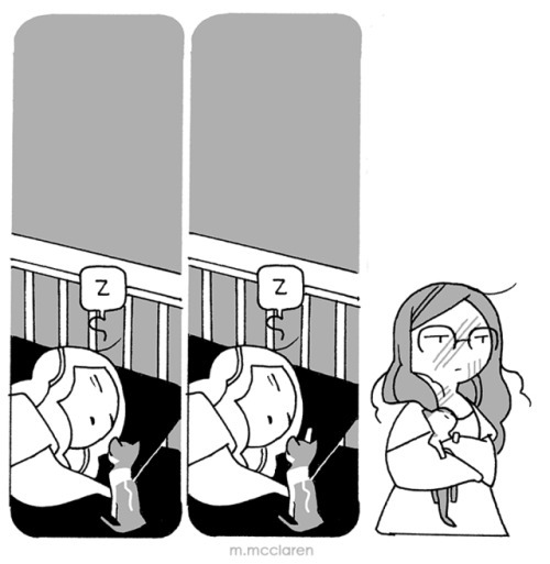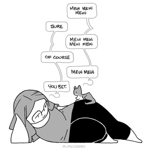[Description: An illustration of myself lying down. Sitting on my hip is a kitten. He likes to talk, and I am answering him back as though we are having a normal conversation.]