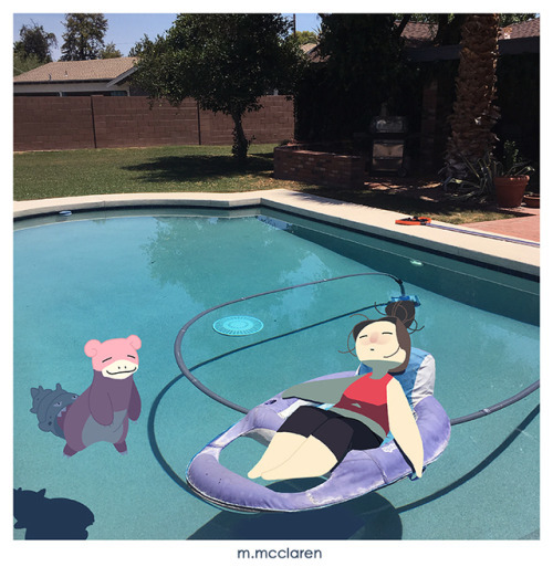 [Description: A photo of a pool. A cartoon of myself lies floating in a floaty chair. Beside me is a Slowbro from Pokemon.]