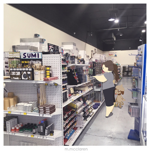 [Description: A photo from inside an art supply store. A cartoon of myself peruses the aisles. Beside me is a Smeargle from Pokemon.]