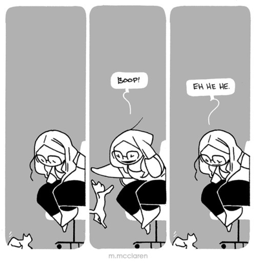 [Description: A three panel comic. I sit on a chair looking down at a kitten on the ground. In the second panel, I go ‘Boop!’ and reach my arms up. In response the kitten jumps into the air. By the third panel we’ve returned to sitting as I giggle to myself.]
